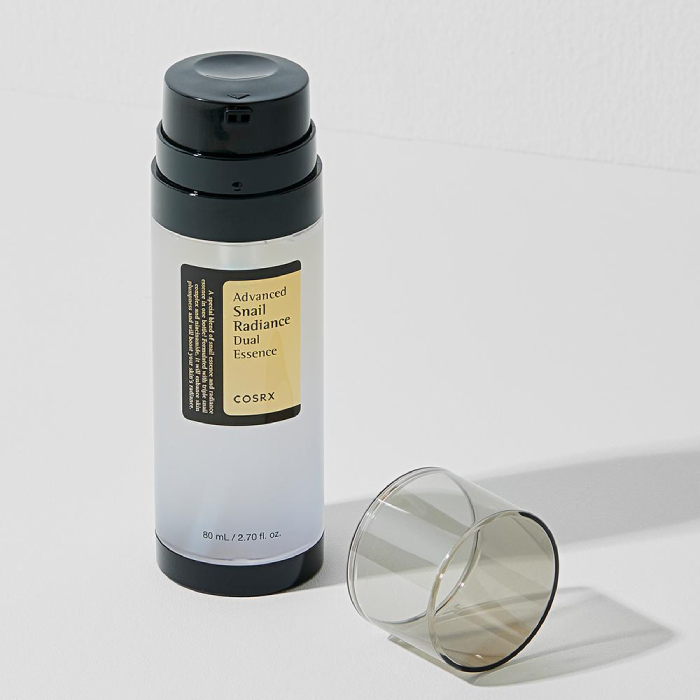 Το Cosrx Advanced Snail Radiance Dual Essence είναι ένα διπλό essence που συνδυάζει τα οφέλη της βλεννίνης σαλιγκαριού και την νιασιναμίδης. Μια αντλία, δυο πανίσχυρα συστατικά, ένας συνδυασμός που φωτίζει, ενυδατώνει, συσφίγγει και αφήνει την επιδερμίδα πιο ελαστική και plumped. Το έκκριμμα σαλιγκαριού κάνει απαλή απολέπιση, η αλλαντοΐνη ηρεμεί και καταπραύνει, το κολλαγόνο και η ελαστίνη αναγεννούν τα κύτταρα και την επιδερμίδα.